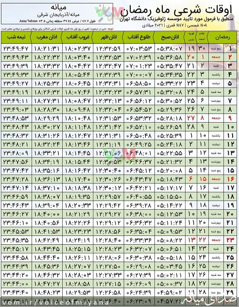 به منظور راحتی و در دسترس بودن همیشگی، جدول اوقات شرعی ماه مبارک رمضان شهر میانه (سال ١٤٠٤ شمسی) بصورت جداگانه و رزوانه در دسترس کاربران محترم قرار گرفته است.