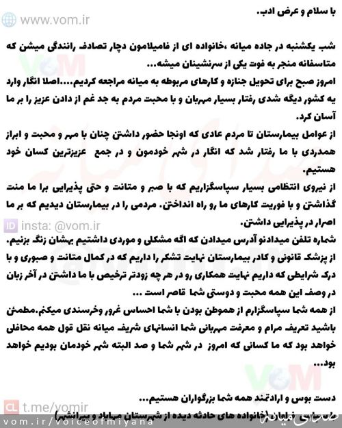 کد خبر: ۱۴۸۴۳۶ گوناگون ۱۵۲ بازدید ۱ دیدگاه (۰ تایید شده) پیام تشکر خانواده حادثه دیده سانحه جاده سرچم از میانه ای ها صدای میانه ۱۴۰۴/۱۱/۲۹ ۱۲:۴۲ پیام تشکر خانواده حادثه دیده سانحه جاده سرچم از میانه ای ها